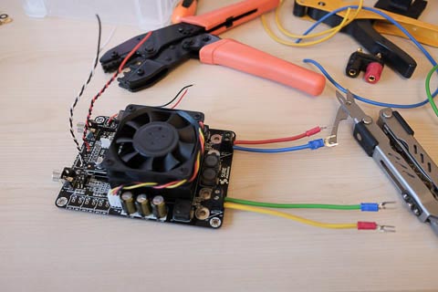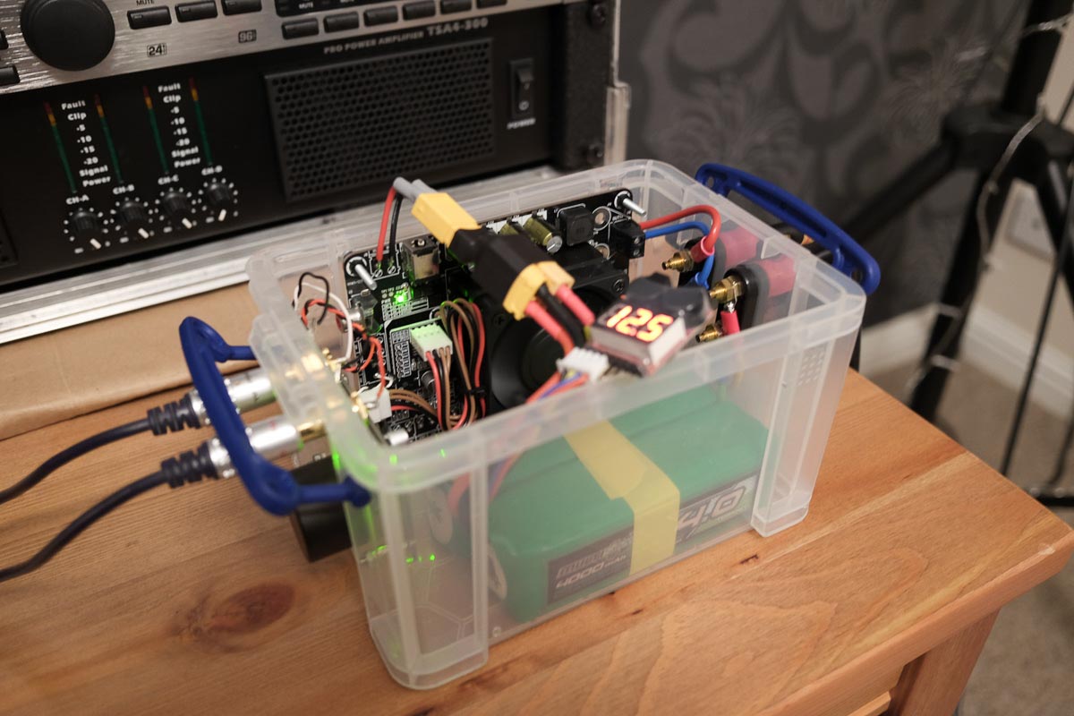 A Sure Electronics/Wondom amplifier board, powered from a pair of 4000mAh 3S LiPo batteries connected in series to give around 24V.