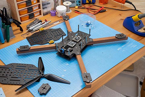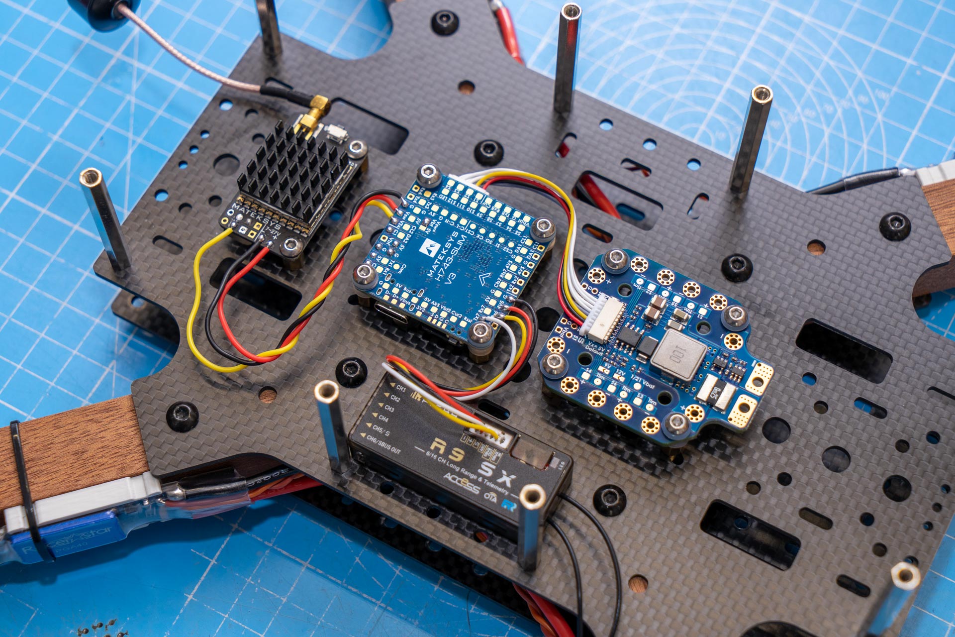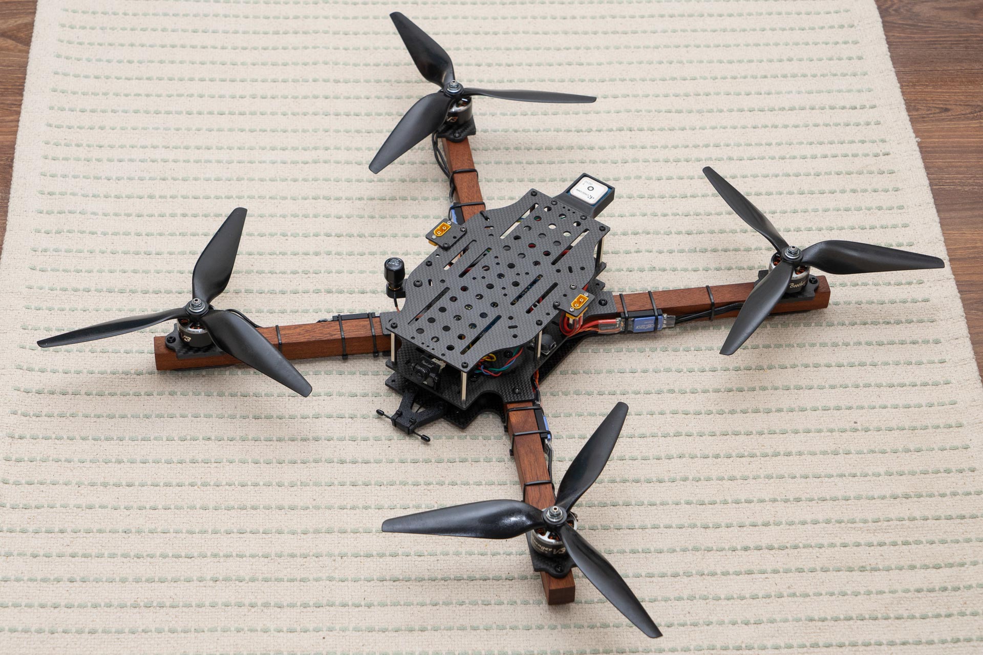 While I really liked the look of my original Macroquad design, I never had much use for the length of the frame while simultaneously the width wasn't quite enough to mount four 21700 cells side by side. So for this new version I both shortened & fattened the carbon parts.