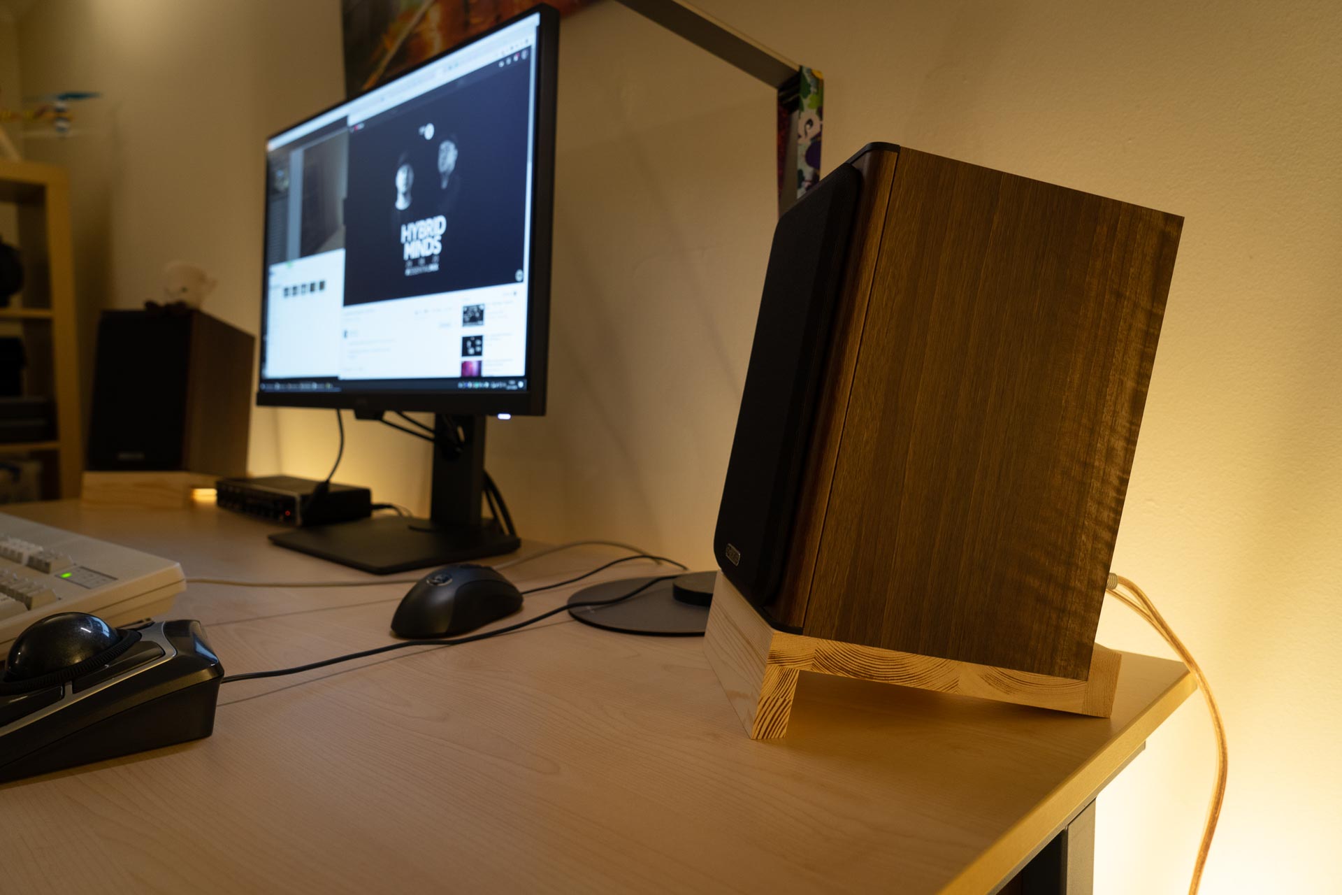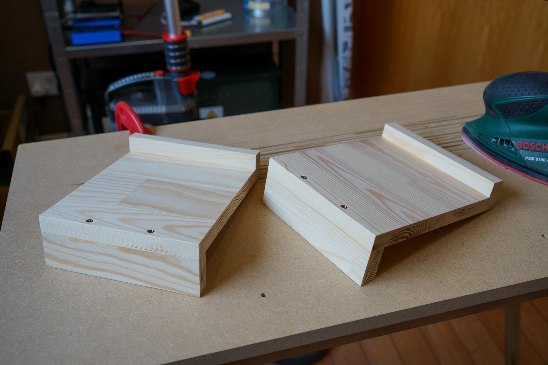 My old foam Auralex MoPADs were too big for the Monitor Audio BX1 speakers & didn't have enough tilt, so I tried doing some bevel cuts with the tracksaw. I ran the assembled stands over a full sheet of sandpaper placed upright on a flat surface to get the front 'foot' perfectly flat with the rear edge flush on the desk.