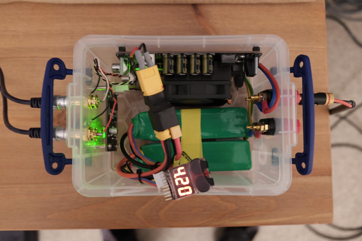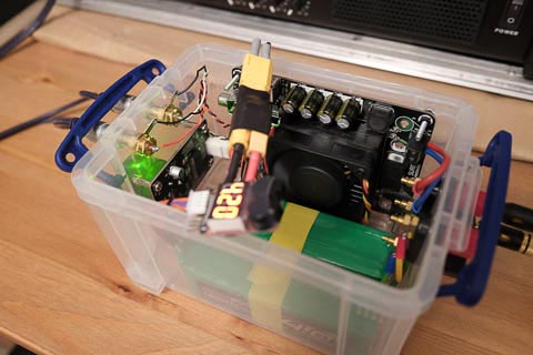 A Sure Electronics/Wondom amplifier board, powered from a pair of 4000mAh 3S LiPo batteries connected in series to give around 24V.