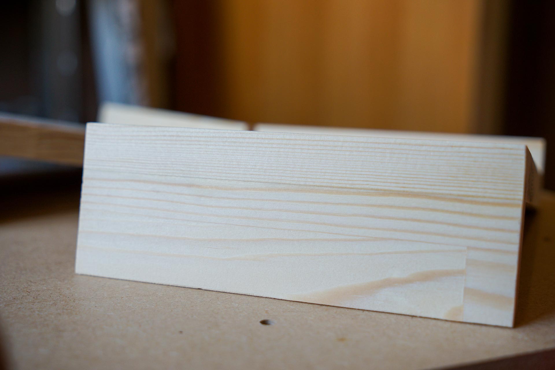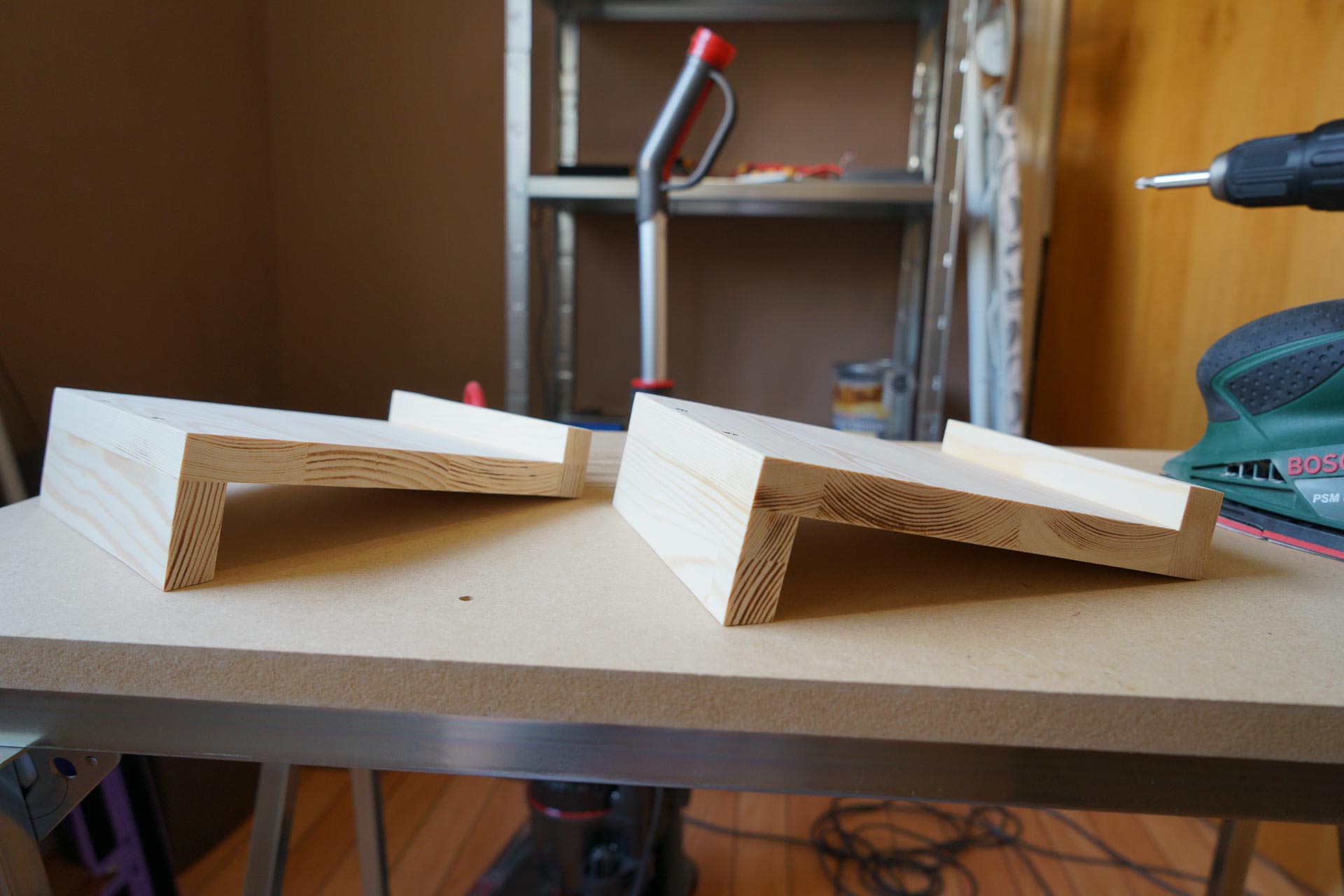 My old foam Auralex MoPADs were too big for the Monitor Audio BX1 speakers & didn't have enough tilt, so I tried doing some bevel cuts with the tracksaw. I ran the assembled stands over a full sheet of sandpaper placed upright on a flat surface to get the front 'foot' perfectly flat with the rear edge flush on the desk.